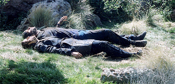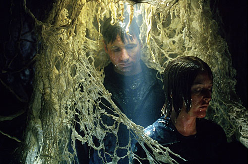 Suddenly, a hand come out of some loose earth. Mulder pulls himself out, covered in goo and dirt. He pulls Scully out with him. Both are breathing hard, coughing and lying exhausted on a grassy field.