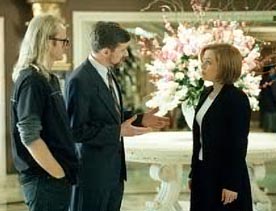 Cut to the lobby, where Scully is just checking in. Byers and Langly meet her there and are trying to explain where Mulder is when EMT's and hotel workers dash by, one of them mentioning Jimmy's name. Byers and Langly take off after them, and Scully follows.